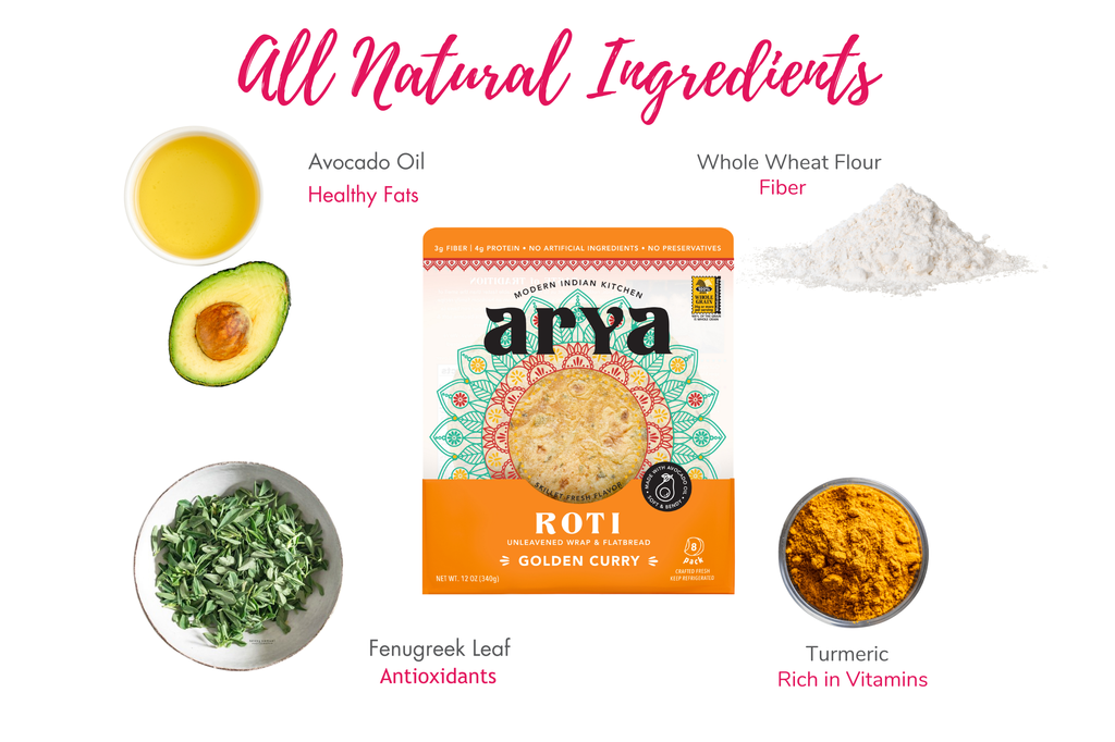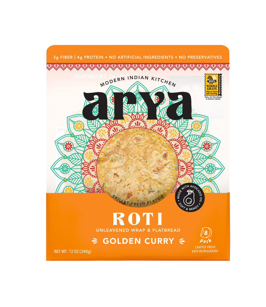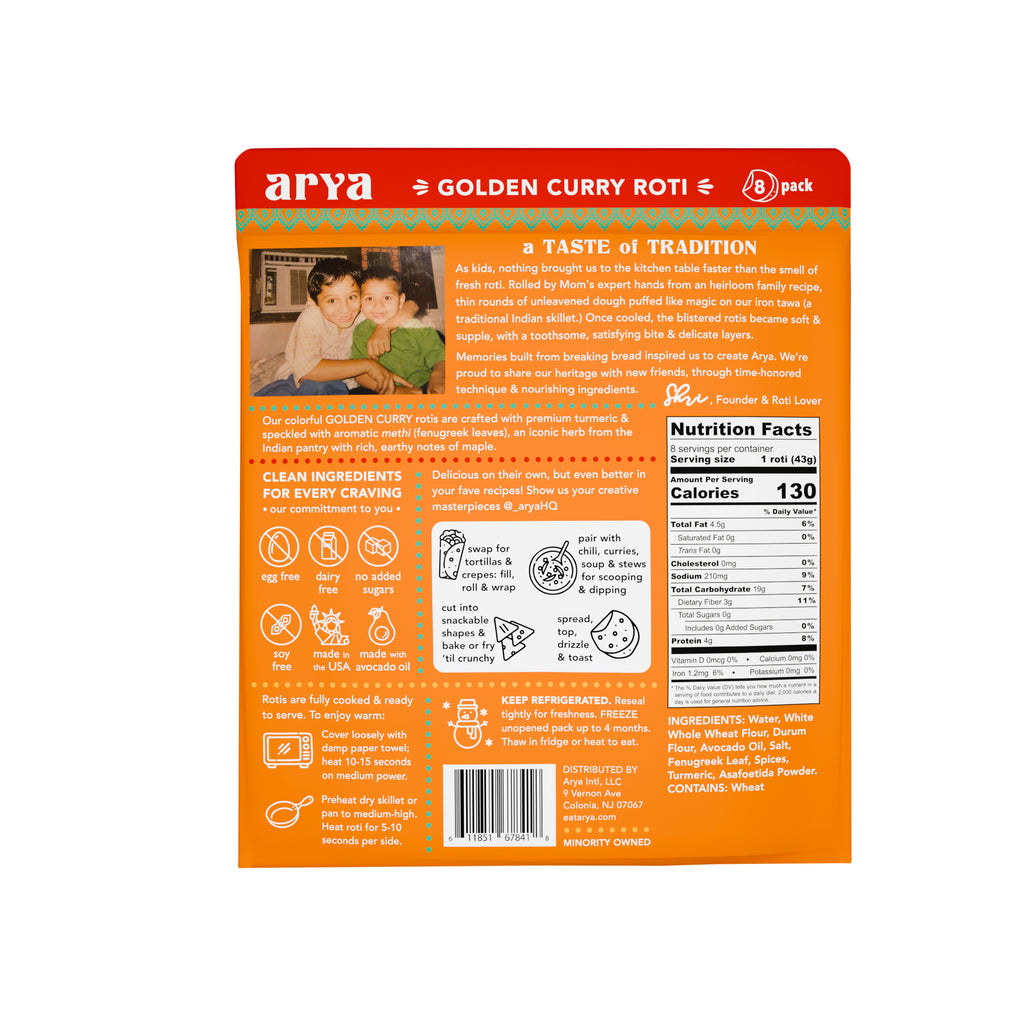 Golden Curry Rotis are our vibrant superfood spin on the Indian breadbasket staple, crafted with a special blend of whole wheat and whole grain durum flours for a good source of gut-healthy fiber. Vibrant, earthy turmeric, maple-scented fenugreek leaf and a touch of umami-packed asafoetida create an alluring flavor reminiscent of a mild, buttery and balanced Indian curry.